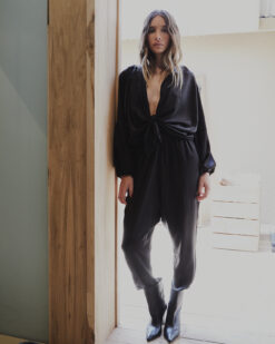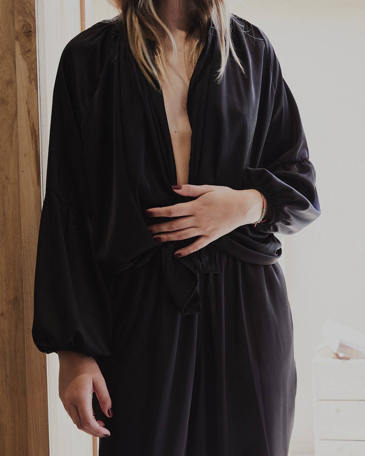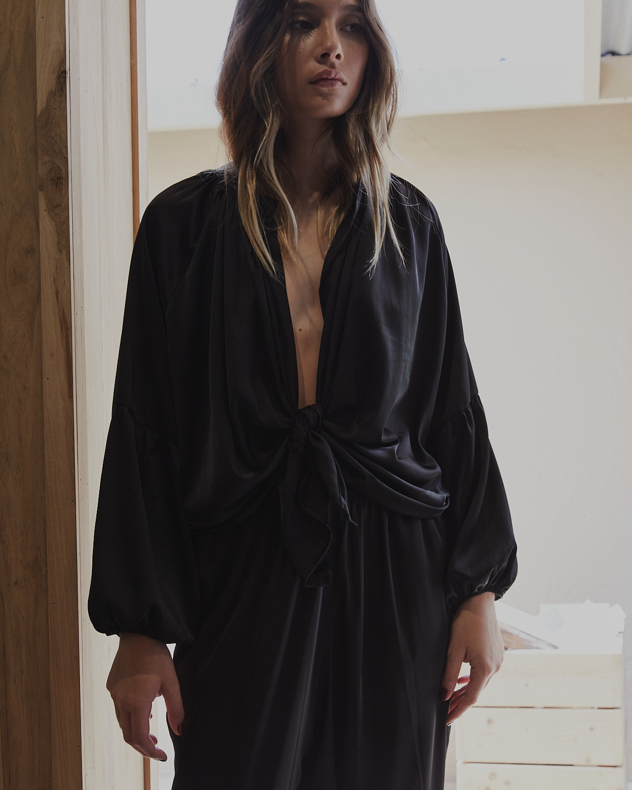 Blusa confeccionada en satén. Cuello mao y escote pico con lazo en el mismo tejido. Manga larga abullonada acabada en puño con elástico.