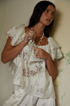 Blusa confeccionada en encaje de algodón. Cuello bote terminado con doble volado y detalle de lazos en escote espalda.