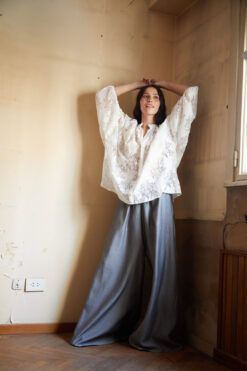 Camisa confeccionada en encaje de algodón. Cuello mao y escote pico. Manga larga abullonada acabada en puño con elástico.