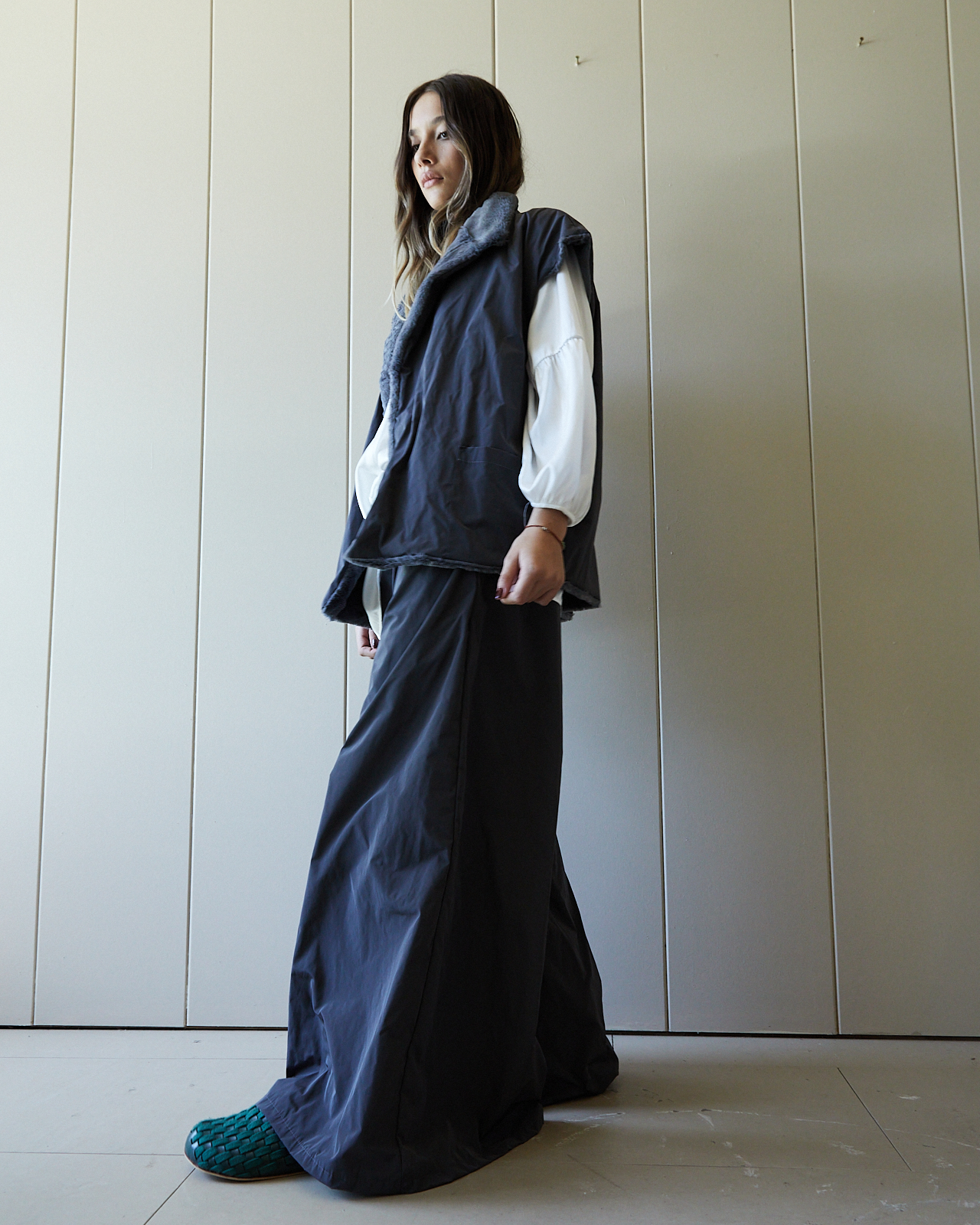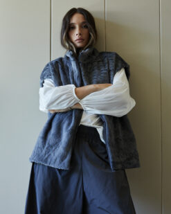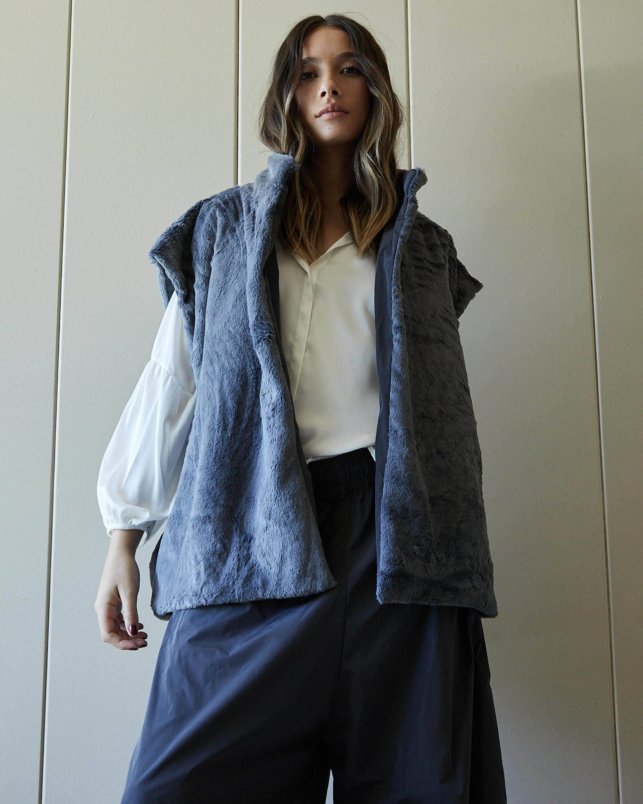 Chaleco reversible confeccionado en hilatura de acetato. Hombro caído y cuello tortuga. Forrado con hilatura efecto piel al tono.