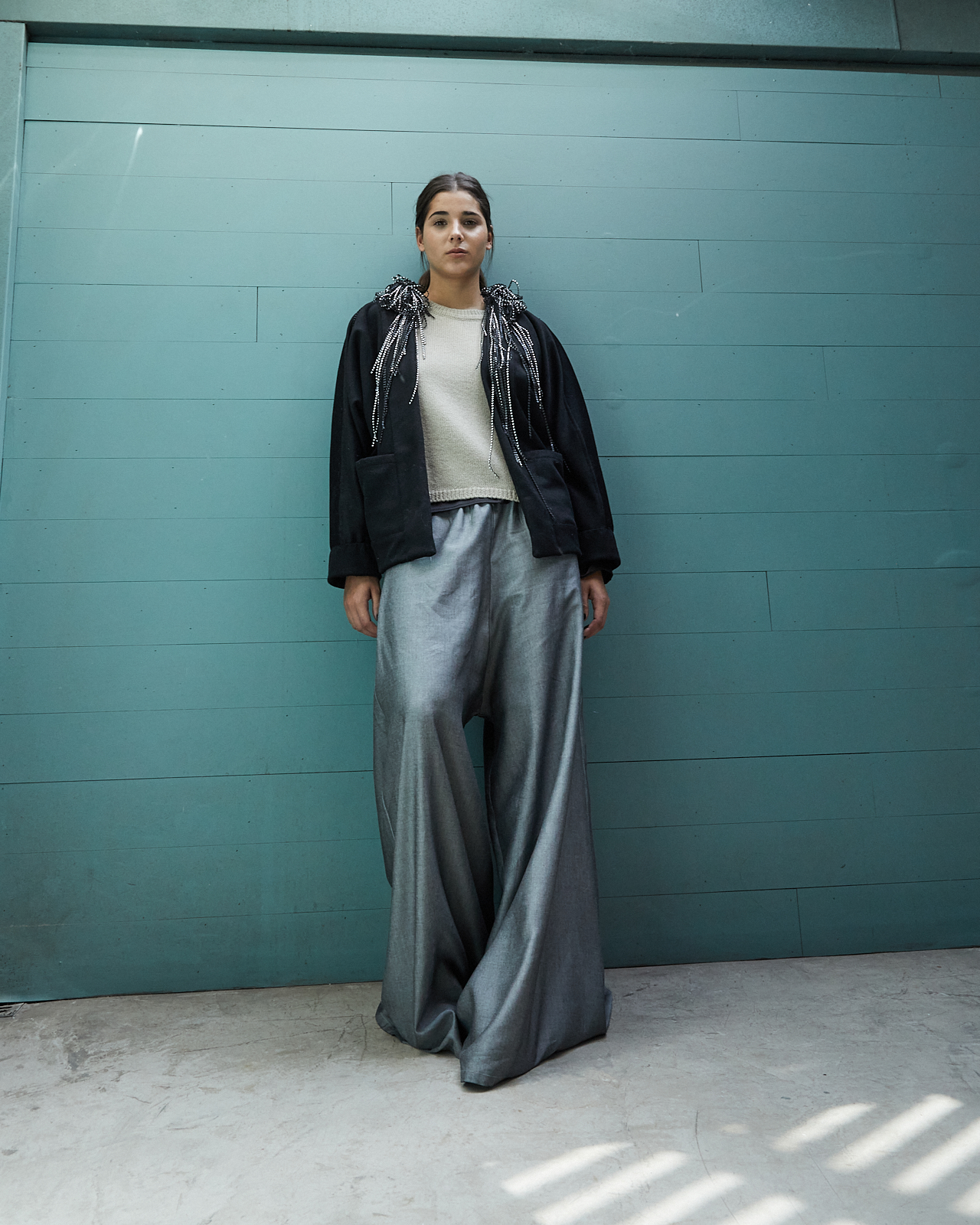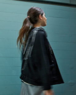 Chaqueta confeccionada en paño de lana 100%. Manga larga con hombro caído y puños elastizados. Bolsillos laterales en delantero. Cintura con elástico en espalda.