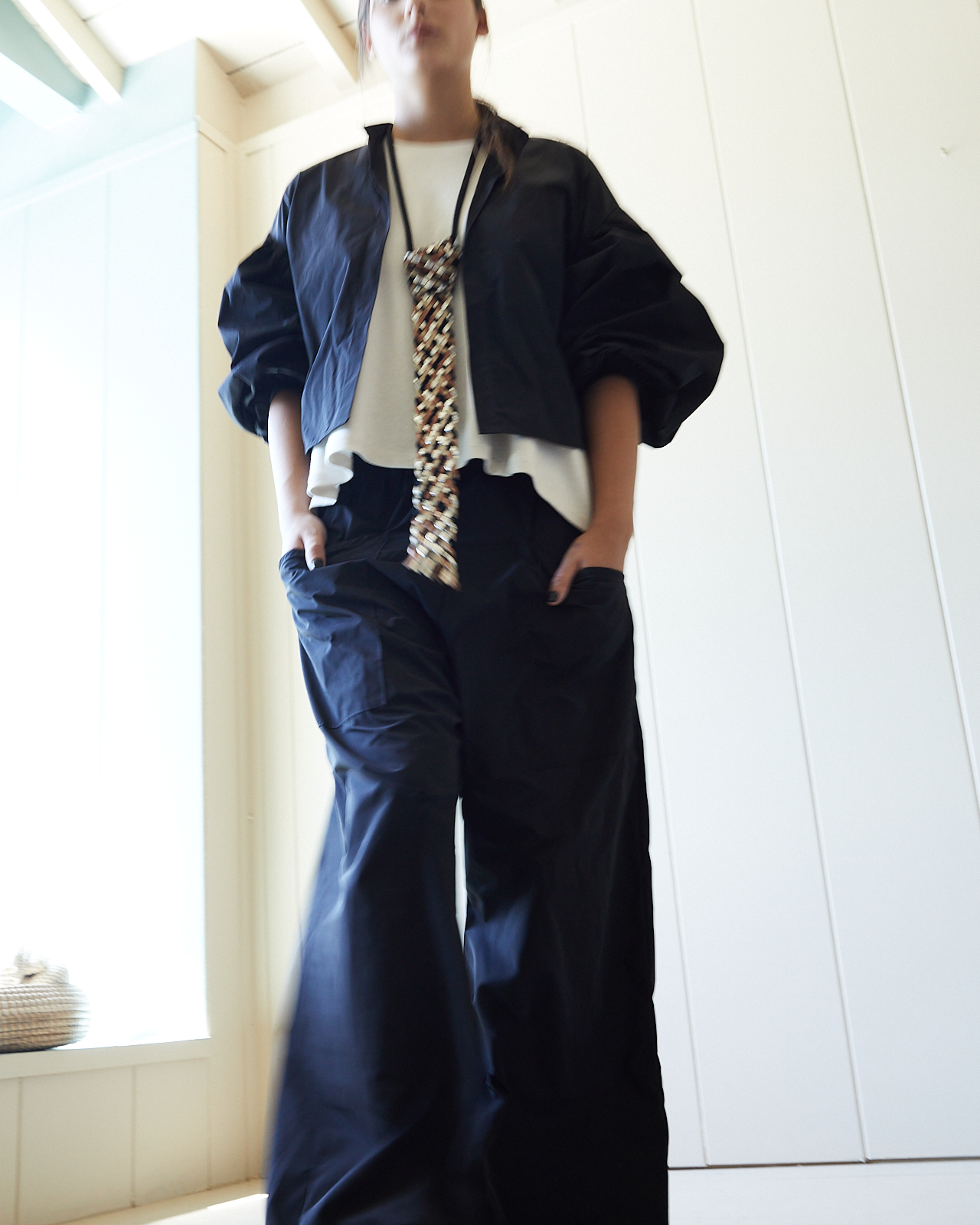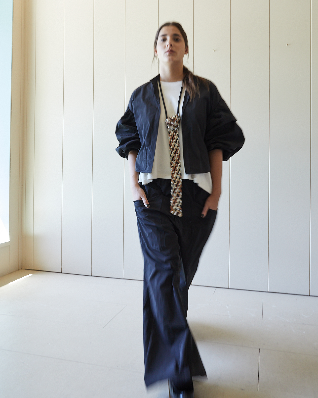 Chaqueta corta confeccionada en hilatura de acetato. Cuello mao y escote pico. Manga larga abullonada terminada en puño con elástico.