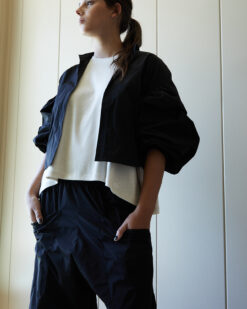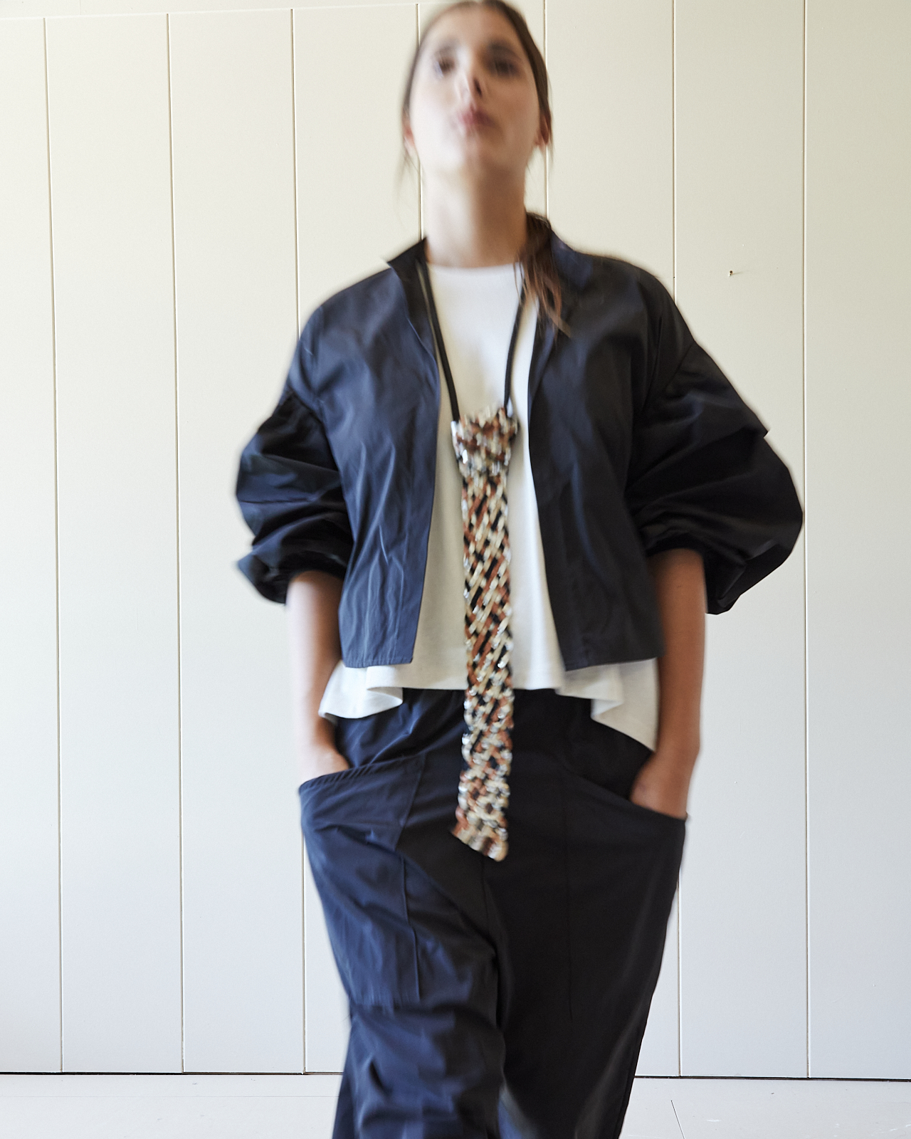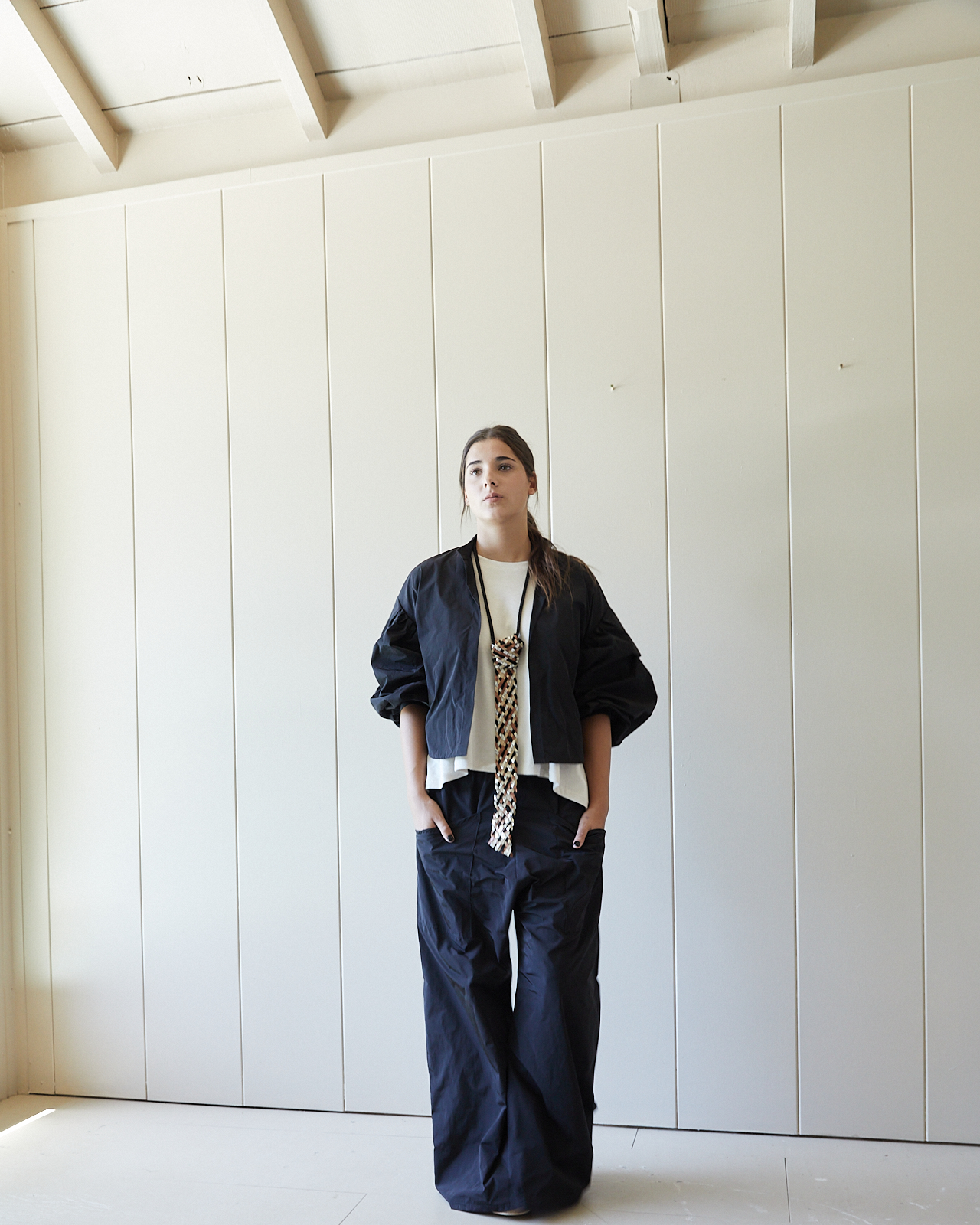 Pantalón botamanga ancha confeccionado en hilatura de acetato. Tiro largo y cintura con elástico ajustable. Bolsillos plaqué en delantero.