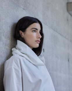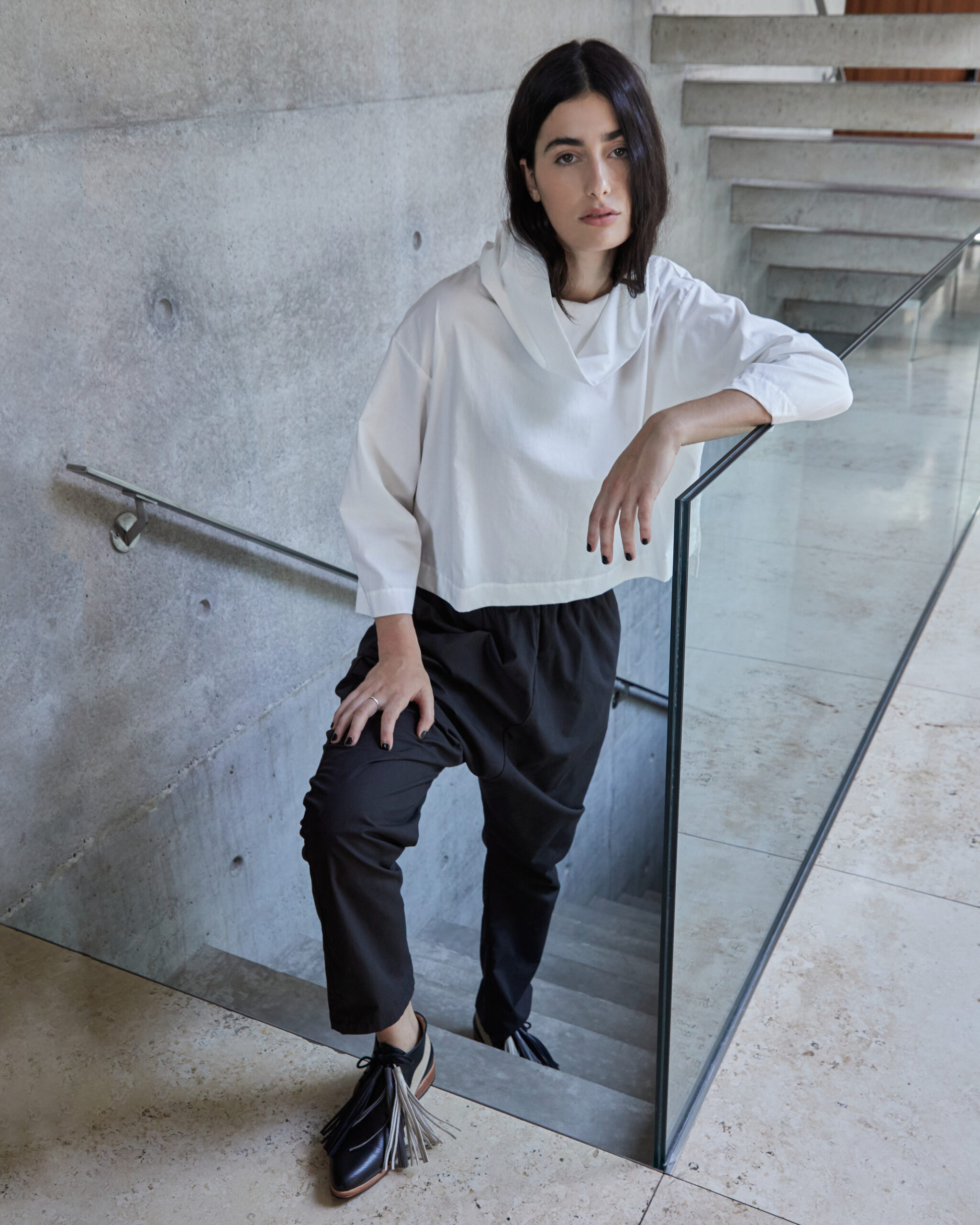 Blusa corta cuello polera confeccionado en hilatura vegetal 100%. Tajos laterales y manga ancha 3/4.