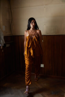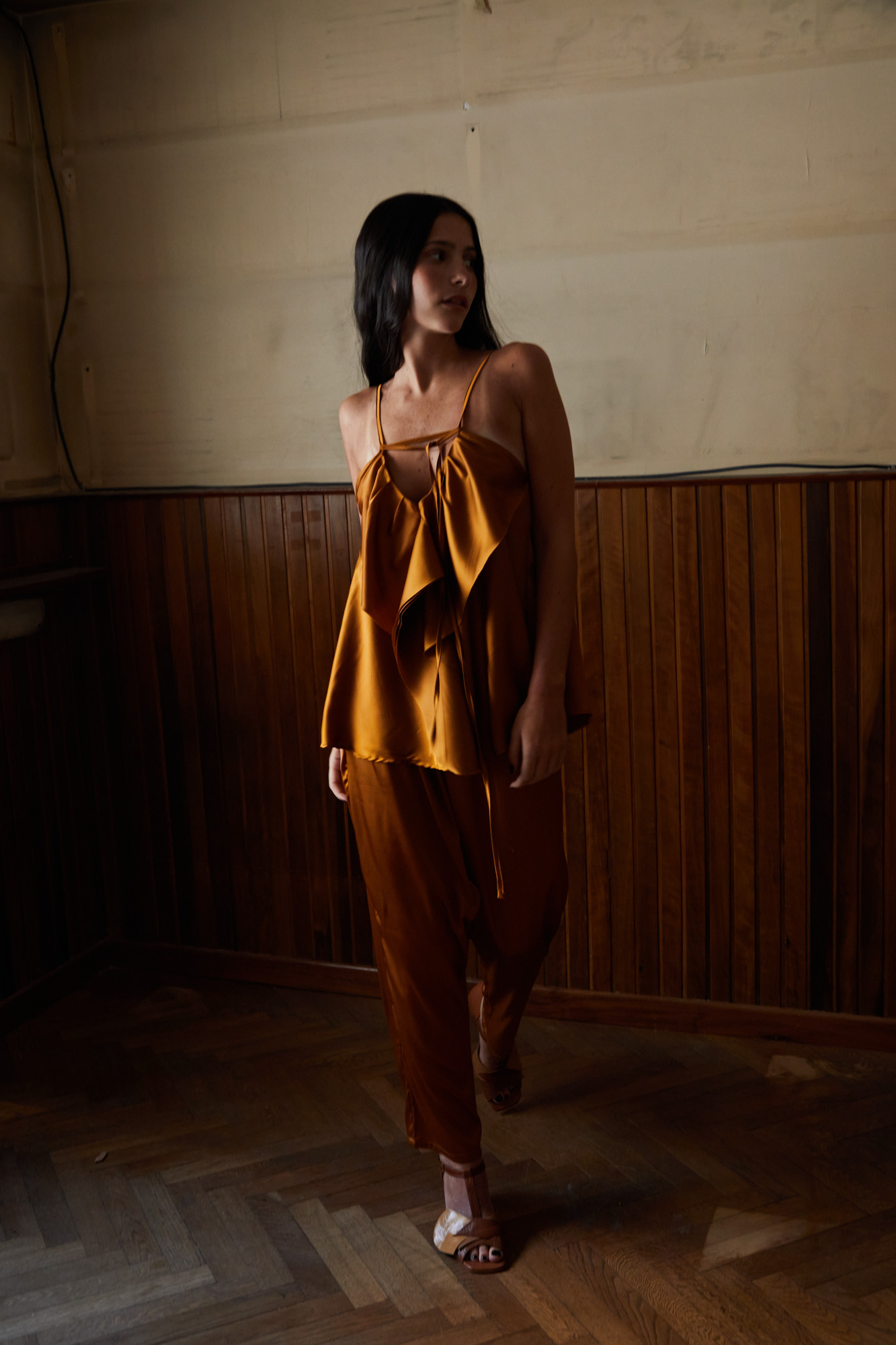 Pantalón lencero cigarette confeccionado en satén. Tiro largo y cintura con elástico ajustable. Bolsillos laterales ocultos en costura.