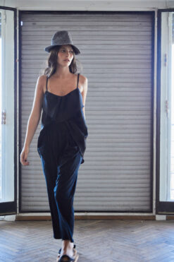 Top lencero confeccionado en satén. Escote en pico y breteles finos. Detalle de volados combinados al tono y lazo regulador.