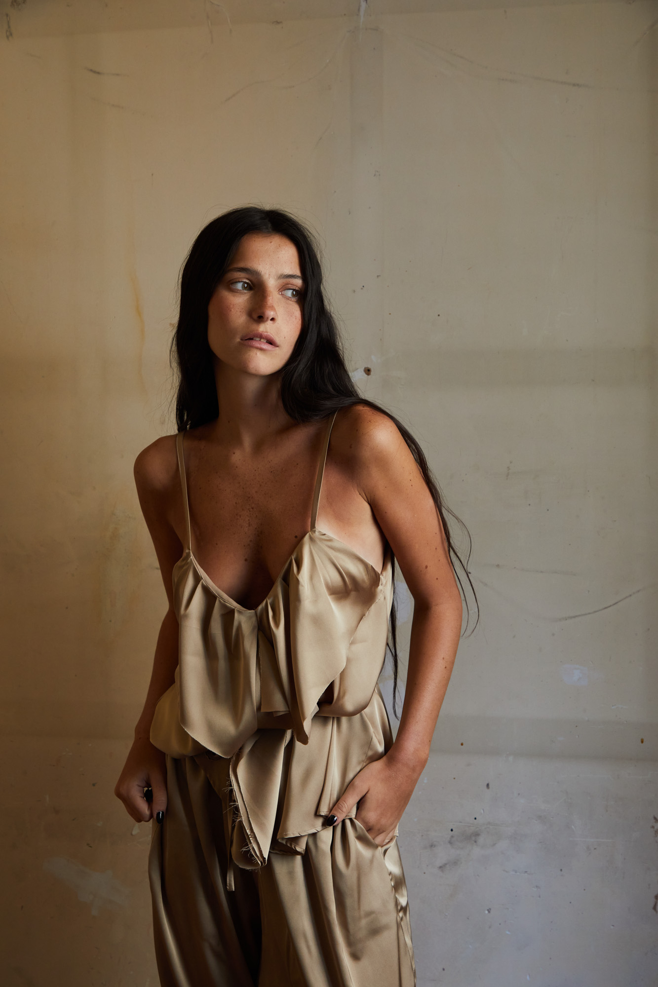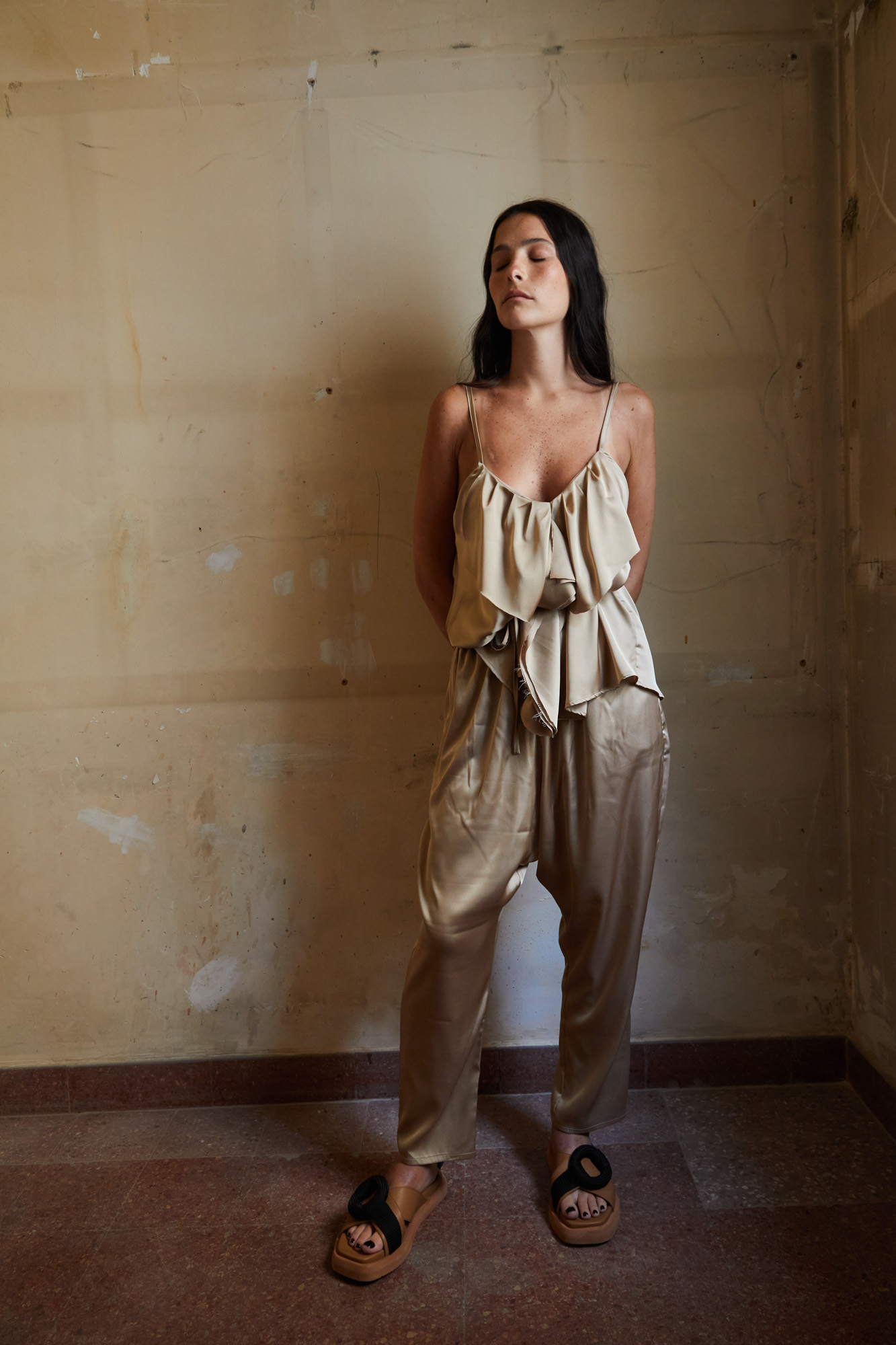 Top lencero confeccionado en satén. Escote en pico y breteles finos. Detalle de volados combinados al tono y lazo regulador.