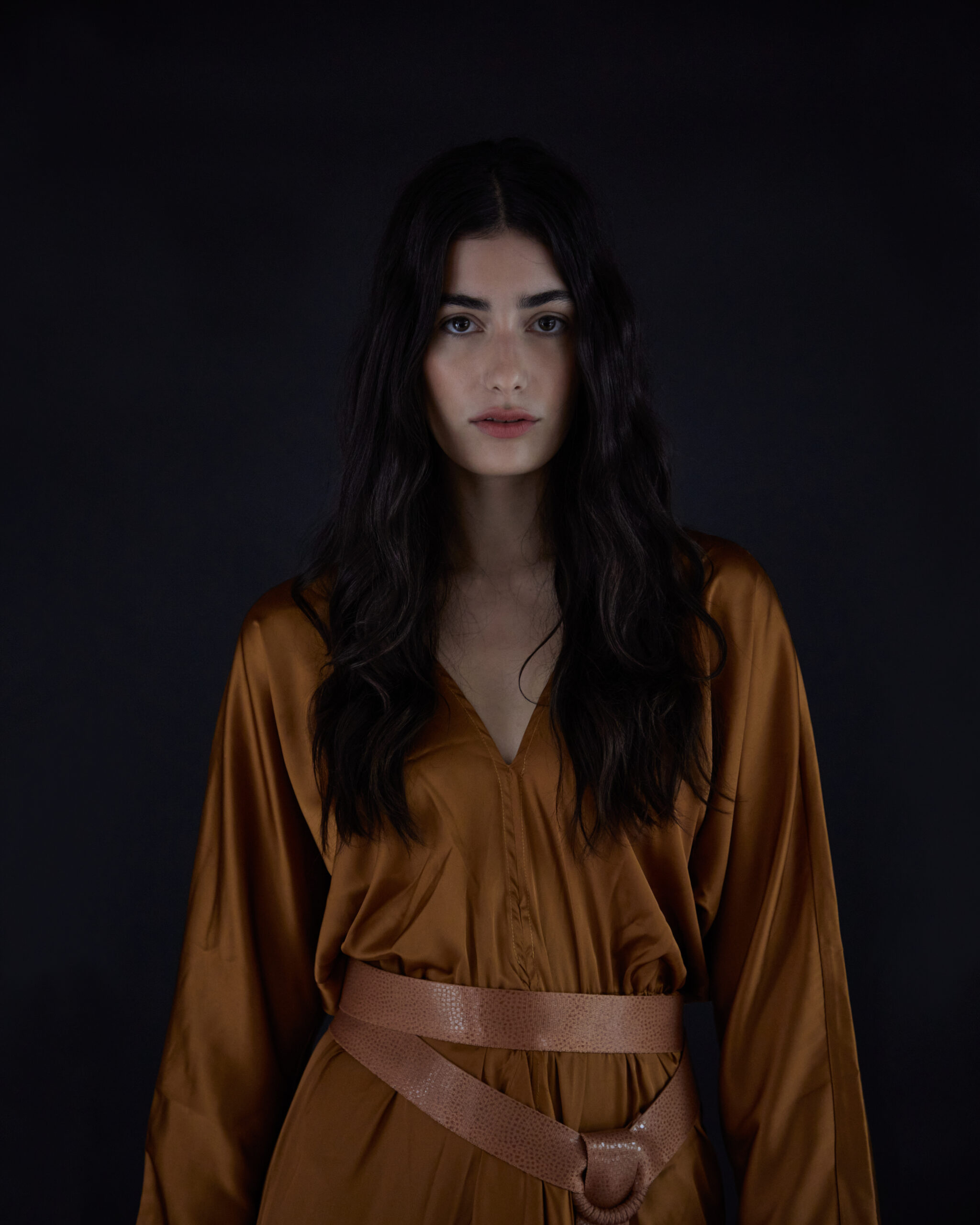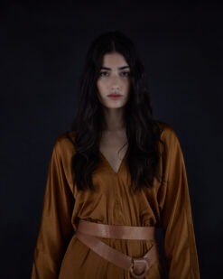Vestido midi confeccionado satén con godet en el centro delantero. Escote pico con manga por debajo del codo. Cinturón en el mismo tejido.